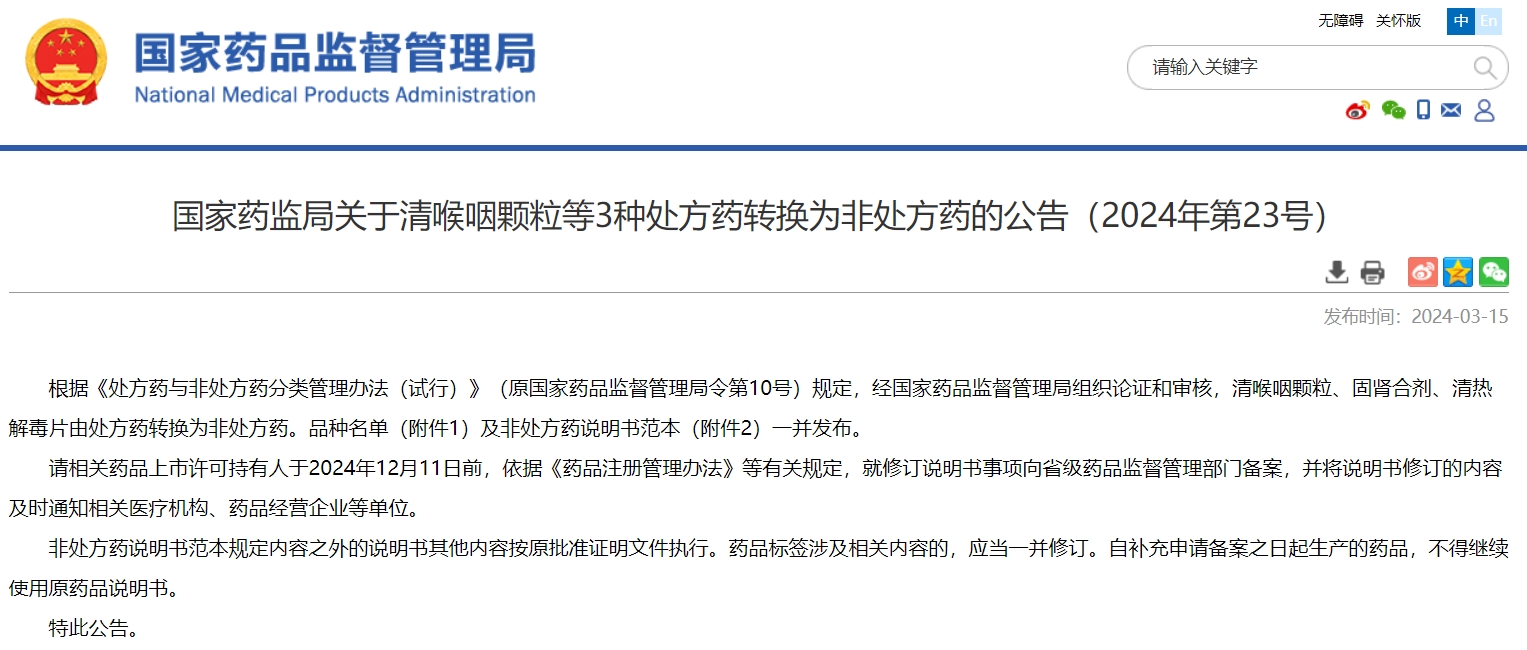 國家藥監(jiān)局關(guān)于清喉咽顆粒等3種處方藥轉(zhuǎn)換為非處方藥的公告(2024年第23號(hào))