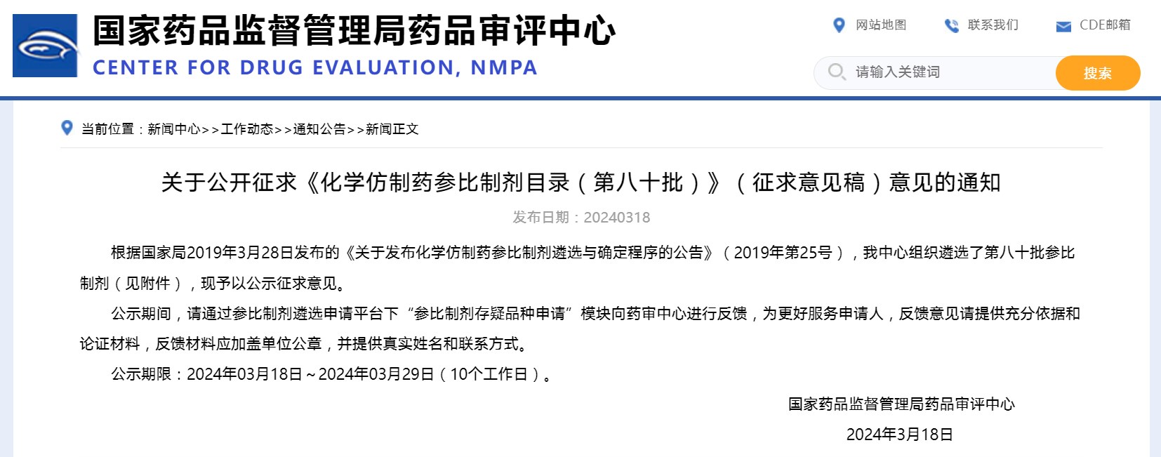 關(guān)于公開征求《化學(xué)仿制藥參比制劑目錄(第八十批)》(征求意見(jiàn)稿)意見(jiàn)的通知