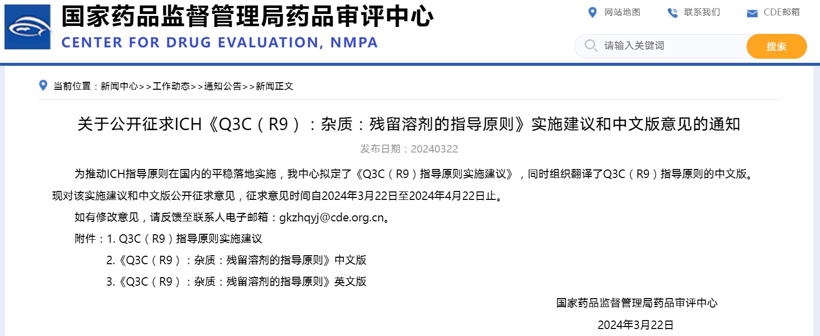 關(guān)于公開征求ICH《Q3C(R9):雜質(zhì):殘留溶劑的指導(dǎo)原則》實(shí)施建議和中文版意見(jiàn)的通知