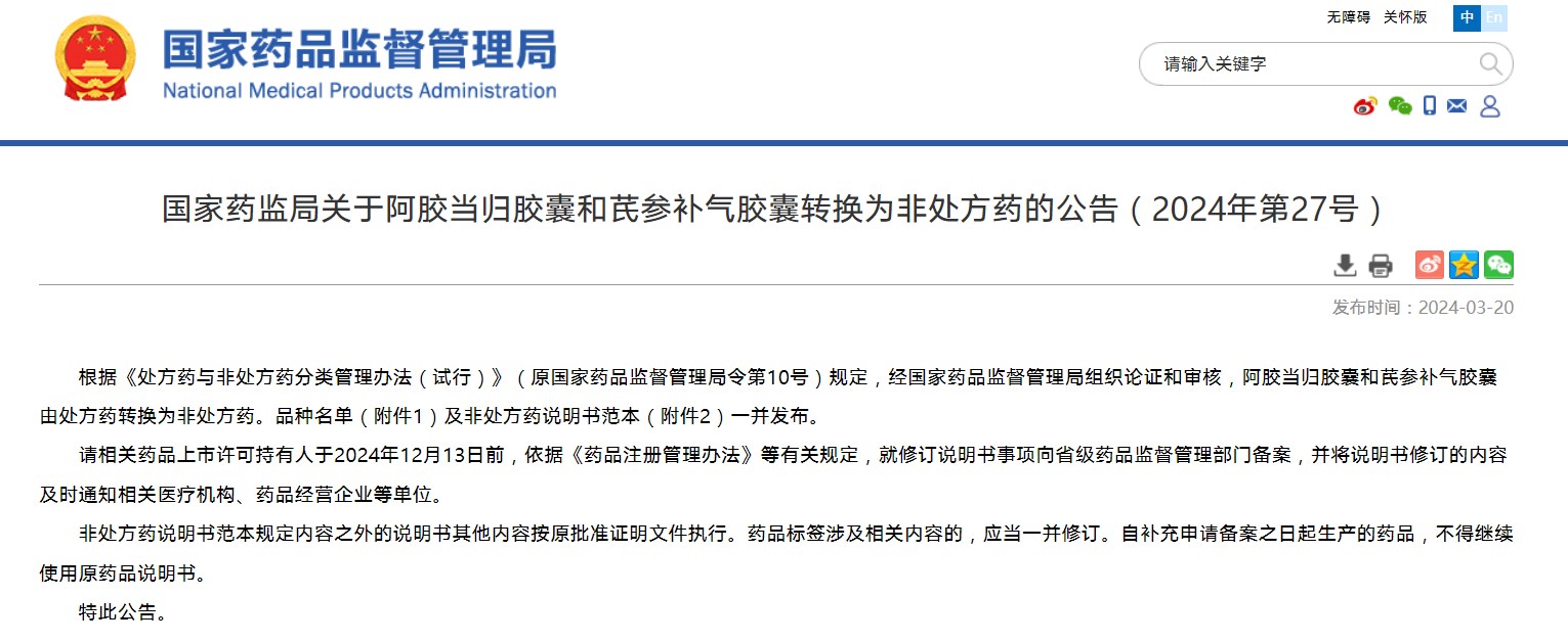 國(guó)家藥監(jiān)局關(guān)于阿膠當(dāng)歸膠囊和芪參補(bǔ)氣膠囊轉(zhuǎn)換為非處方藥的公告(2024年第27號(hào))