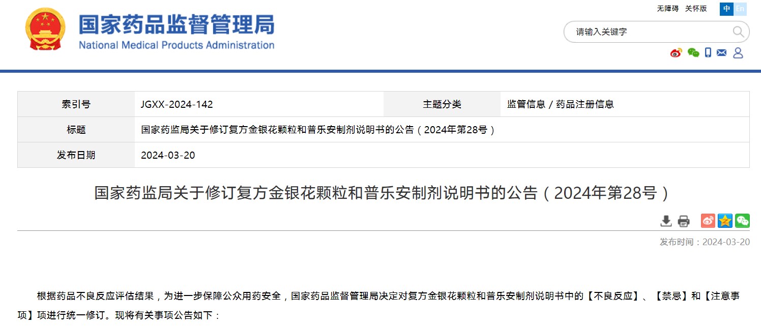 國(guó)家藥監(jiān)局關(guān)于修訂復(fù)方金銀花顆粒和普樂(lè)安制劑說(shuō)明書的公告(2024年第28號(hào))