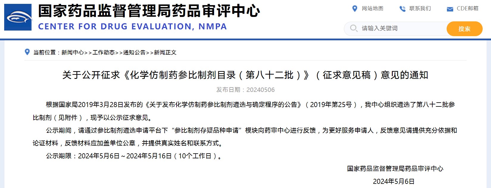關(guān)于公開征求《化學仿制藥參比制劑目錄(第八十二批)》(征求意見稿)意見的通知