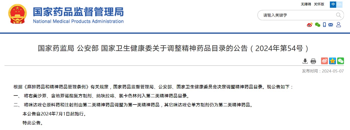 國家藥監(jiān)局 公安部 國家衛(wèi)生健康委關(guān)于調(diào)整精神藥品目錄的公告(2024年第54號)