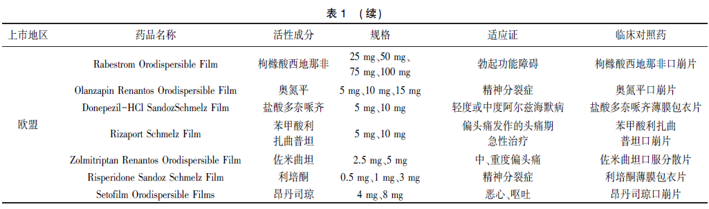 2006年,日本上市了第一個口溶膜處方藥伏格列波糖口溶膜。2010年,美國和歐洲分別上市第一個口溶膜處方藥昂丹司瓊口溶膜(Rapidfilm和Setofilm)。2020年,國家藥品監(jiān)督管理局批準了第一個口溶膜化學藥品奧氮平口溶膜上市。目前,全球已有多個口溶膜產(chǎn)品上市,查詢美國、歐洲、日本藥品監(jiān)管機構網(wǎng)站,部分品種信息見表1。