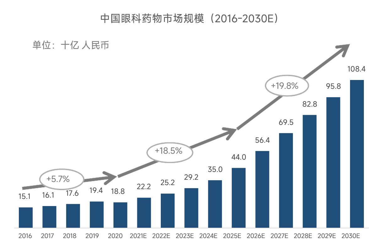 目前,全球眼科市場整體呈現(xiàn)出穩(wěn)定增長、集中度較高的特點(diǎn)。2016年至2020 年,全球眼科藥物市場規(guī)模從277億美元增長至327億美元,復(fù)合年增長率為 4.2%。隨著未來更多眼科創(chuàng)新藥物的研發(fā)和上市,預(yù)計2025年將達(dá)到464億美元,2030年將達(dá)到739億美元。2016-2020年中國眼科藥物市場規(guī)模從151億增長至188億元,復(fù)合年增長率達(dá)5.7%,預(yù)計2025年將達(dá)到440億元,2030年將達(dá)到1084億元。預(yù)計未來,中國將以超過全球2倍的平均增長率快速增長,發(fā)展勢頭強(qiáng)勁。