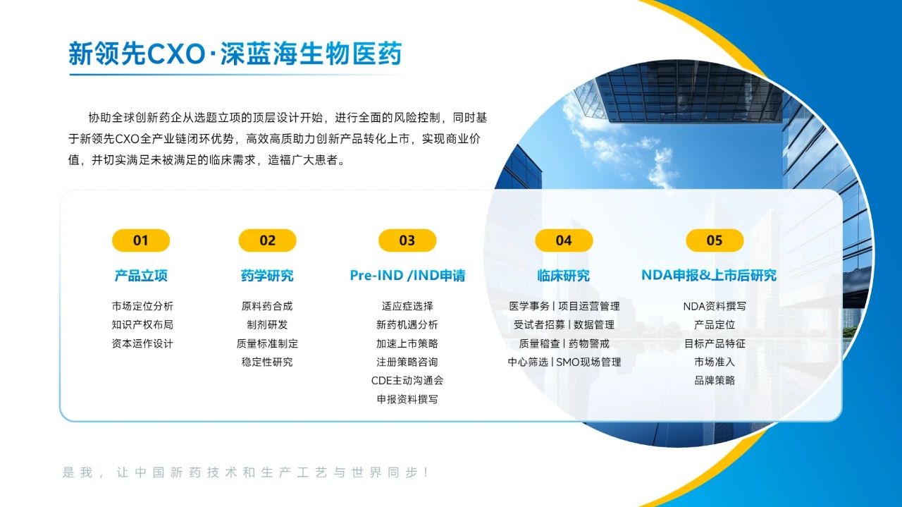 深藍海生物醫(yī)藥是新領先醫(yī)藥(股票代碼600222 )在臨床 CRO 領域的子品牌,成立于 2007 年,秉持“以終為始,頂層設計,做新藥創(chuàng)制的全程合作伙伴"的服務理念,為全球藥企提供覆蓋生物藥、化藥、中藥、醫(yī)療器械、細胞與基因治療等I-III期臨床研究、生物等效性研究、上市后研究、第三方稽查、IND和NDA申報以及醫(yī)學事務等服務??蓾M足不同研發(fā)型企業(yè)的臨床研究定制需求,為國內外客戶打通新藥上市前關鍵瓶頸。