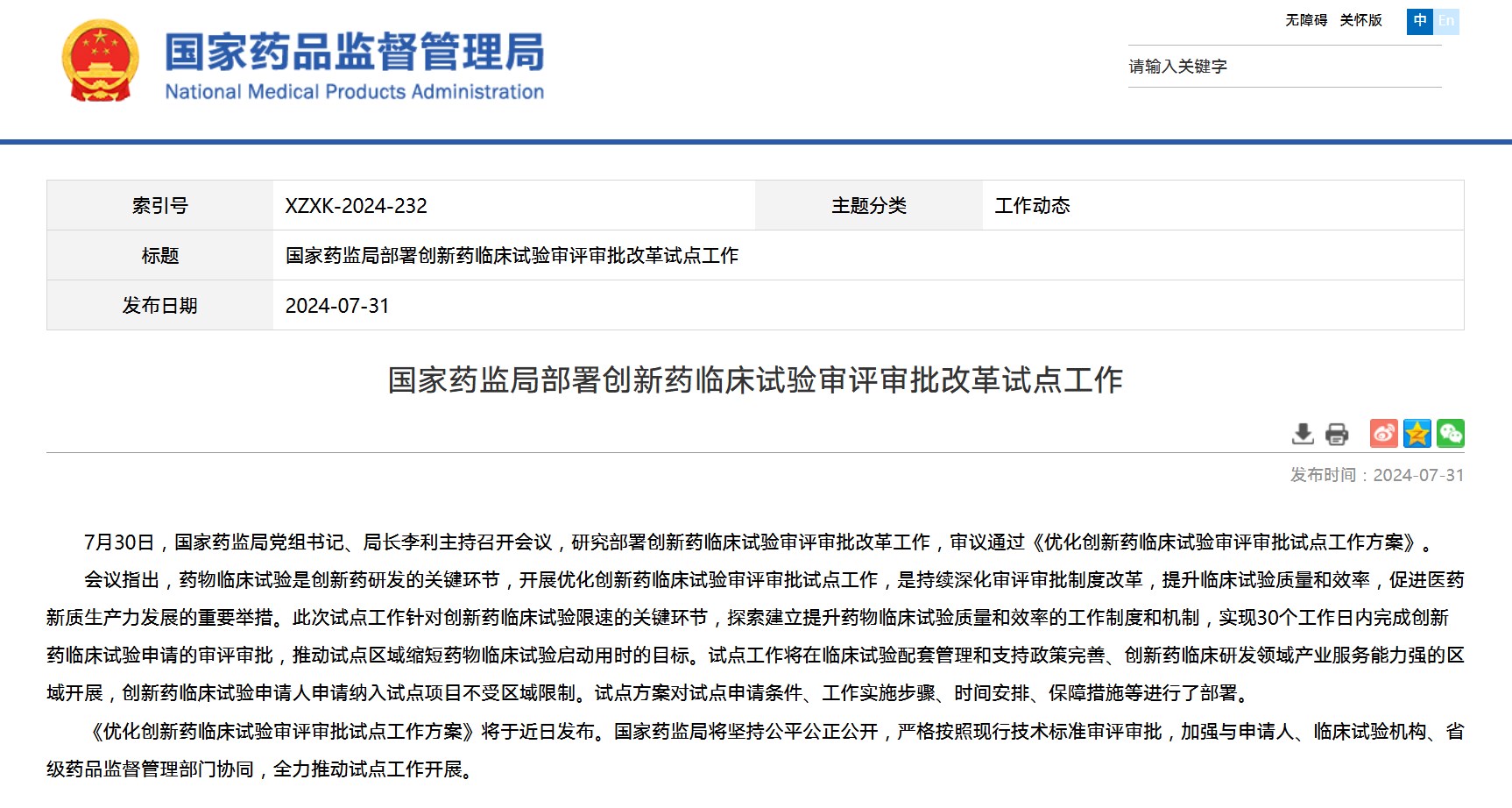國家藥監(jiān)局部署創(chuàng)新藥臨床試驗(yàn)審評(píng)審批改革試點(diǎn)工作(附法規(guī)概覽07.29-08.02)