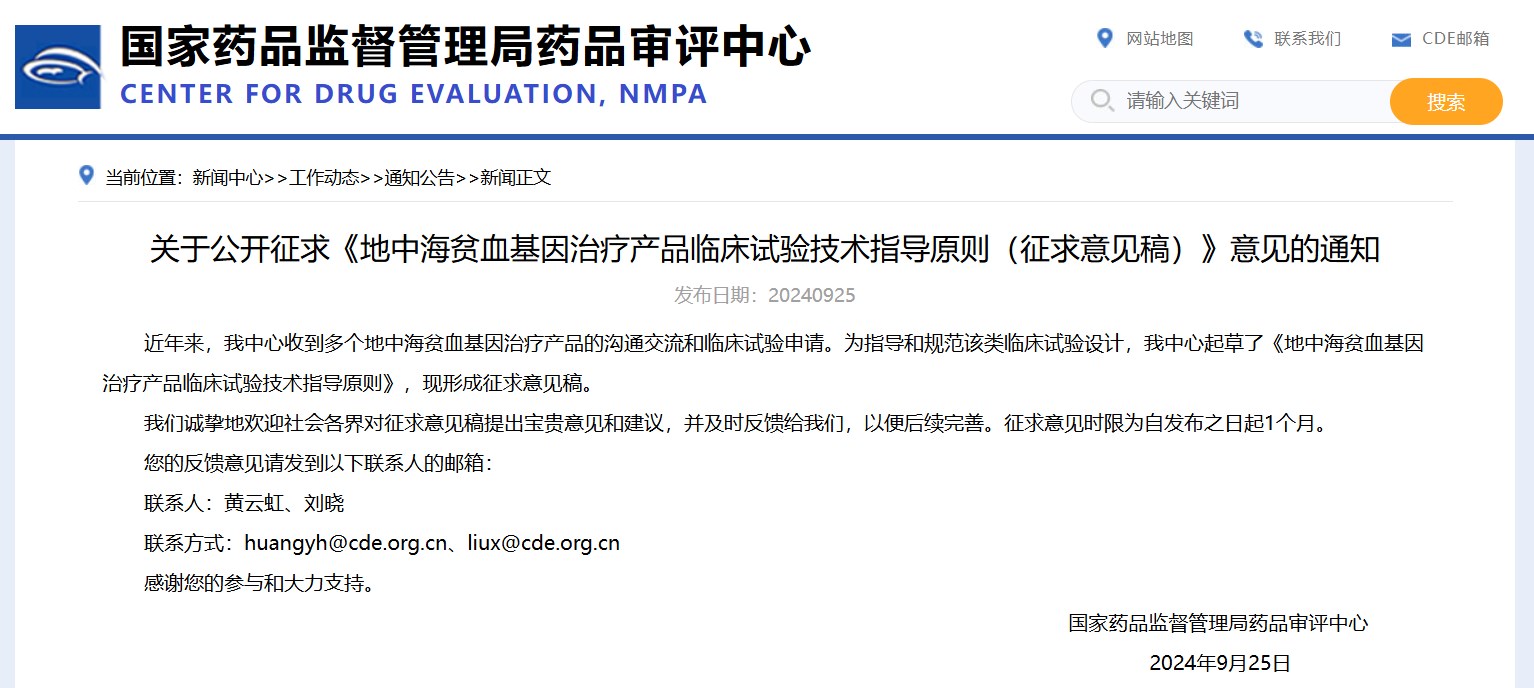 關(guān)于公開征求《地中海貧血基因治療產(chǎn)品臨床試驗(yàn)技術(shù)指導(dǎo)原則(征求意見稿)》意見的通知