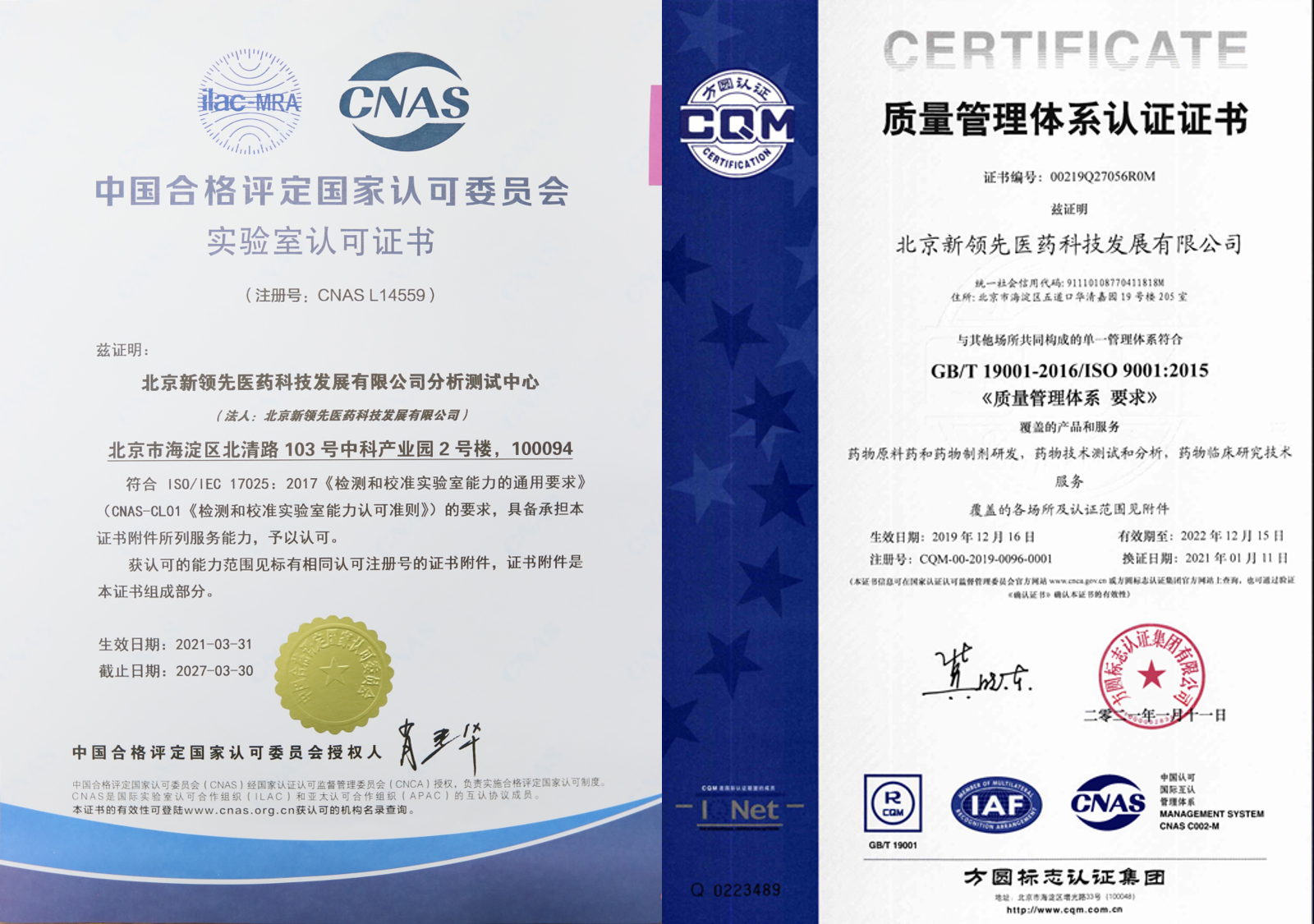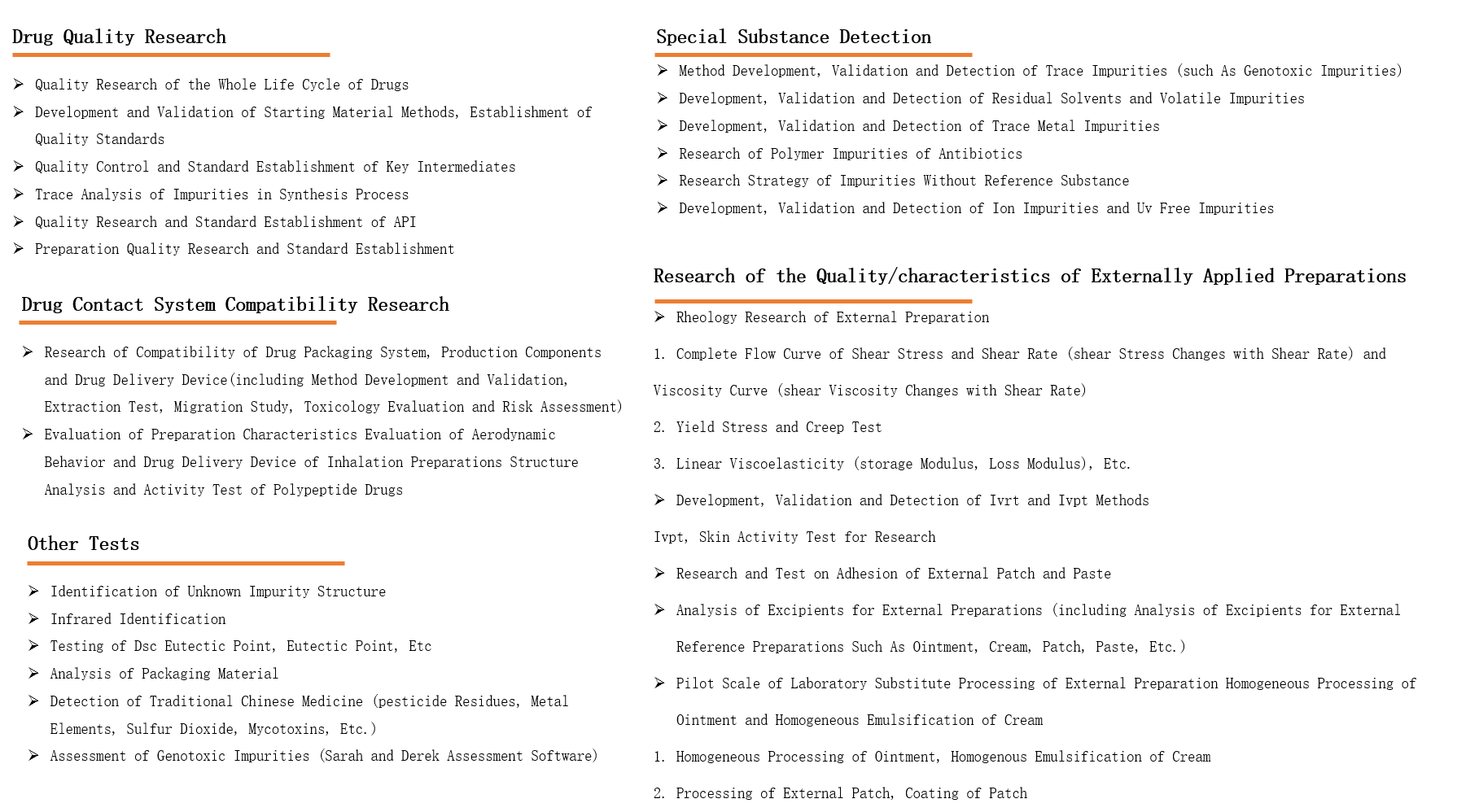 The Analytical Testing Center can provide testing technical services to domestic and foreign pharmaceutical enterprises, and has accumulated rich experience in drug quality research, mainly providing research and testing services that meet the requirements of NMPA, FDA, EMA and other regulations, such as the analysis of trace substances, genotoxic impurities, element impurities, residual solvents, polymer impurities, complex preparation excipients, as well as drug contact system compatibility research. The Center has successively passed the ISO9001 Quality Management System Certification and the Laboratory Accreditation Qualification of China National Accreditation Service for Conformity Assessment(CNAS)