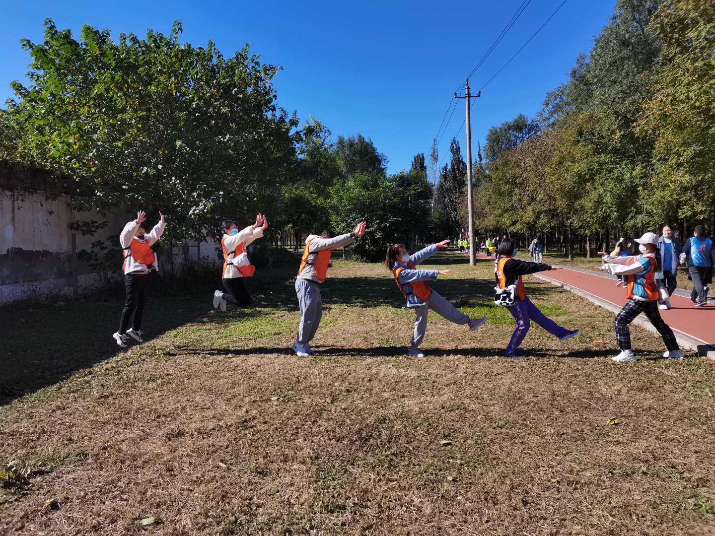 ▲ All team members hold high the team flag, listen to the autumn wind, step on fallen leaves, talk and laugh, and accompany their peers.