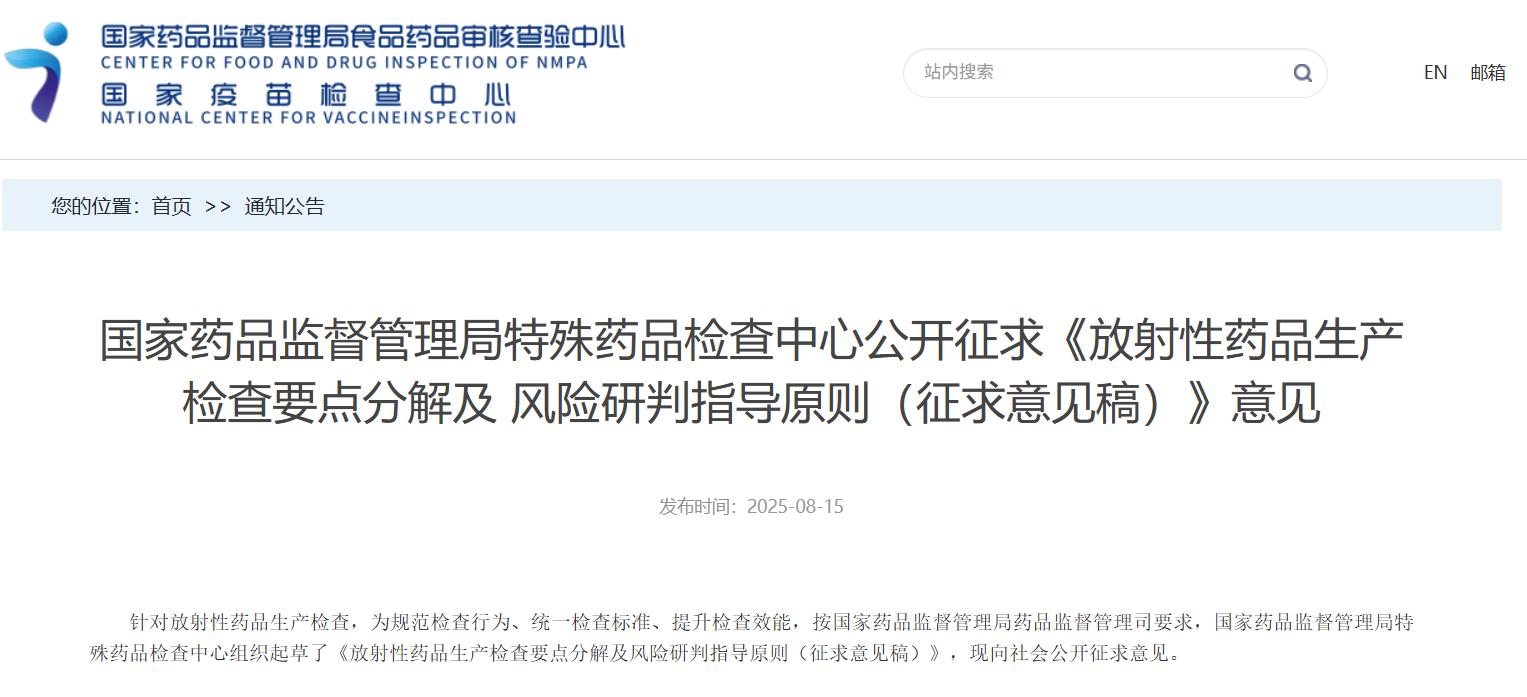 國(guó)家藥品監(jiān)督管理局特殊藥品檢查中心公開(kāi)征求《放射性藥品生產(chǎn)檢查要點(diǎn)分解及 風(fēng)險(xiǎn)研判指導(dǎo)原則(征求意見(jiàn)稿)》意見(jiàn)