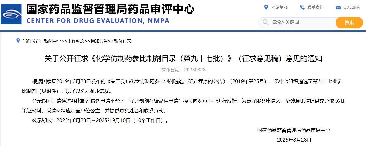 關(guān)于公開征求《化學(xué)仿制藥參比制劑目錄(第九十七批)》(征求意見稿)意見的通知