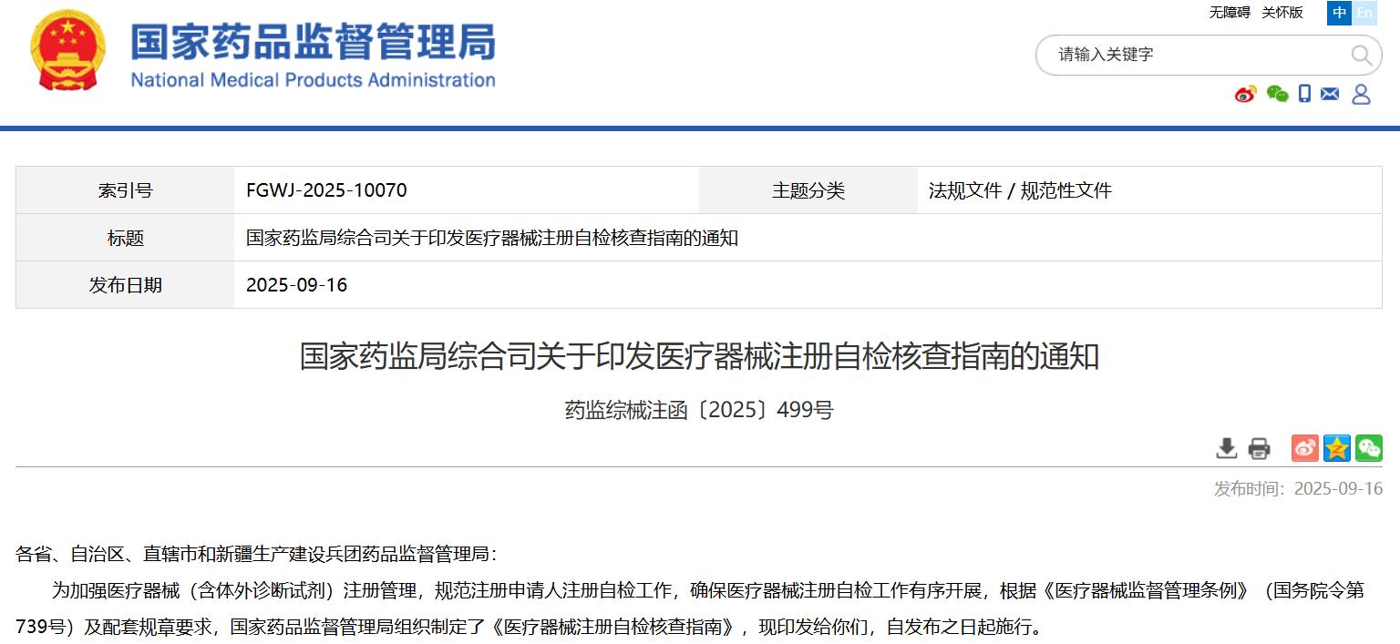國家藥監(jiān)局綜合司關(guān)于印發(fā)醫(yī)療器械注冊自檢核查指南的通知