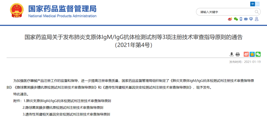 關(guān)于發(fā)布肺炎支原體IgM/IgG抗體檢測試劑等3項注冊技術(shù)審查指導(dǎo)原則的通告 (2021年第4號)