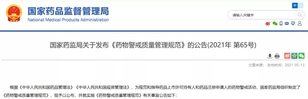 國家藥監(jiān)局關(guān)于發(fā)布《藥物警戒質(zhì)量管理規(guī)范》的公告(2021年 第65號)
