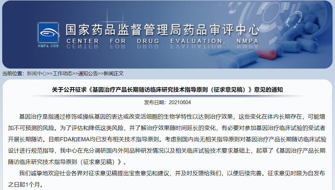 關(guān)于公開征求《基因治療產(chǎn)品長期隨訪臨床研究技術(shù)指導(dǎo)原則(征求意見稿)》意見的通知