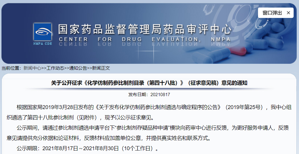 關于公開征求《化學仿制藥參比制劑目錄(第四十八批)》(征求意見稿)意見的通知