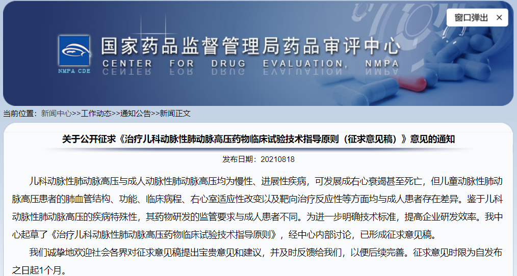 關于公開征求《治療兒科動脈性肺動脈高壓藥物臨床試驗技術指導原則(征求意見稿)》意見的通知
