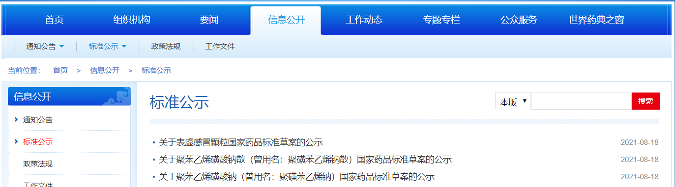 本周表虛感冒顆粒、聚苯乙烯磺酸鈉散(曾用名:聚磺苯乙烯鈉散)、聚苯乙烯磺酸鈉(曾用名:聚磺苯乙烯鈉)國家藥品標準草案公示。