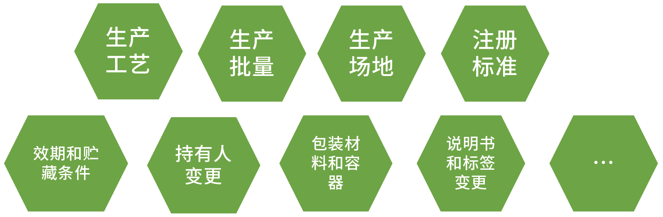 藥品上市后變更包括注冊管理事項(xiàng)變更和生產(chǎn)監(jiān)管事項(xiàng)變更,也就是涉及注冊批件和生產(chǎn)許可證相關(guān)事項(xiàng)的變更。依據(jù)變更對藥品安全性、有效性和質(zhì)量可控性的風(fēng)險(xiǎn)和產(chǎn)生影響的程度,將變更劃分為審評類變更,備案類變更和報(bào)告類變更。