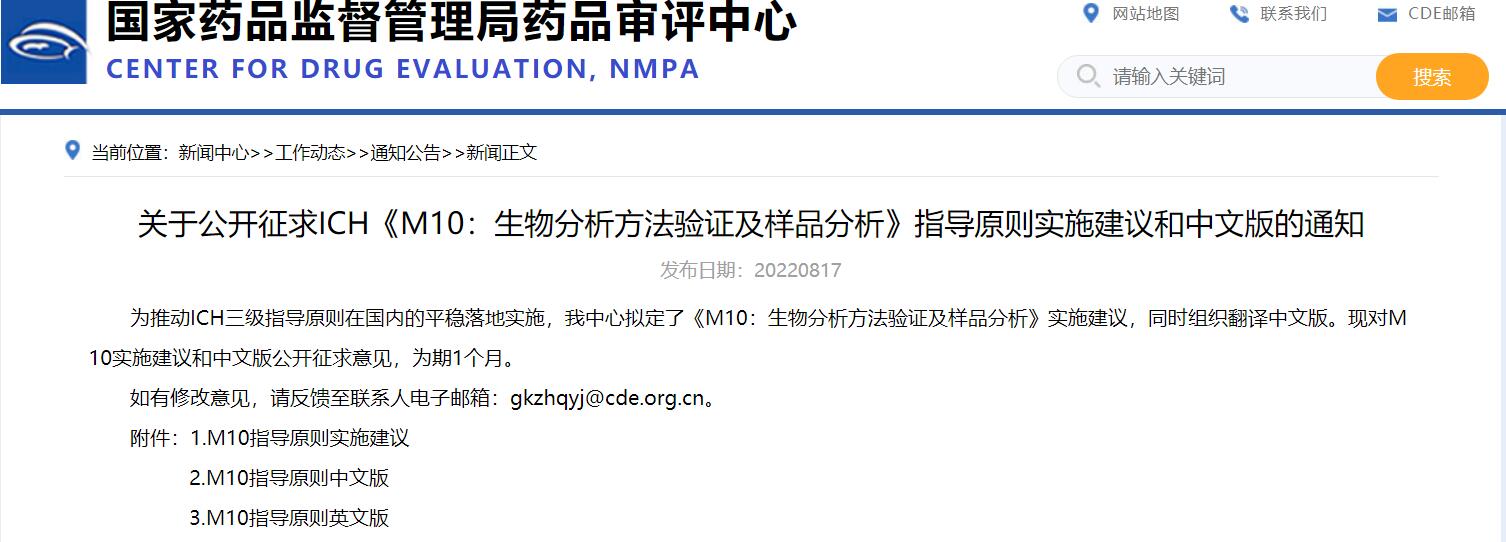 關(guān)于公開征求ICH《M10:生物分析方法驗證及樣品分析》指導(dǎo)原則實施建議和中文版的通知