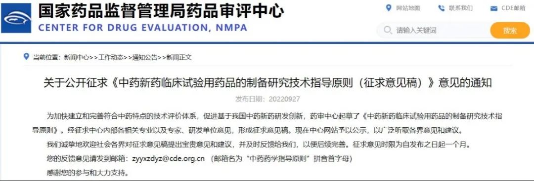 關(guān)于公開征求《中藥新藥臨床試驗用藥品的制備研究技術(shù)指導(dǎo)原則(征求意見稿)》意見的通知