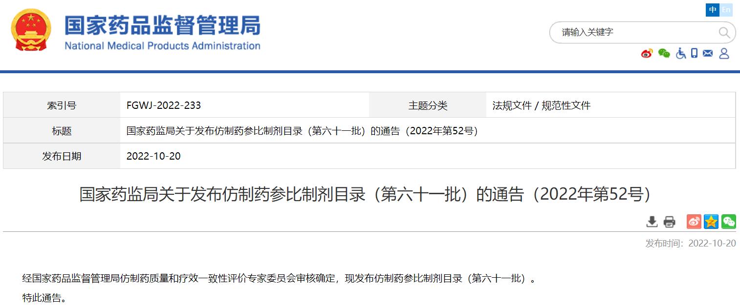 國(guó)家藥監(jiān)局關(guān)于發(fā)布仿制藥參比制劑目錄(第六十一批)的通告(2022年第52號(hào))