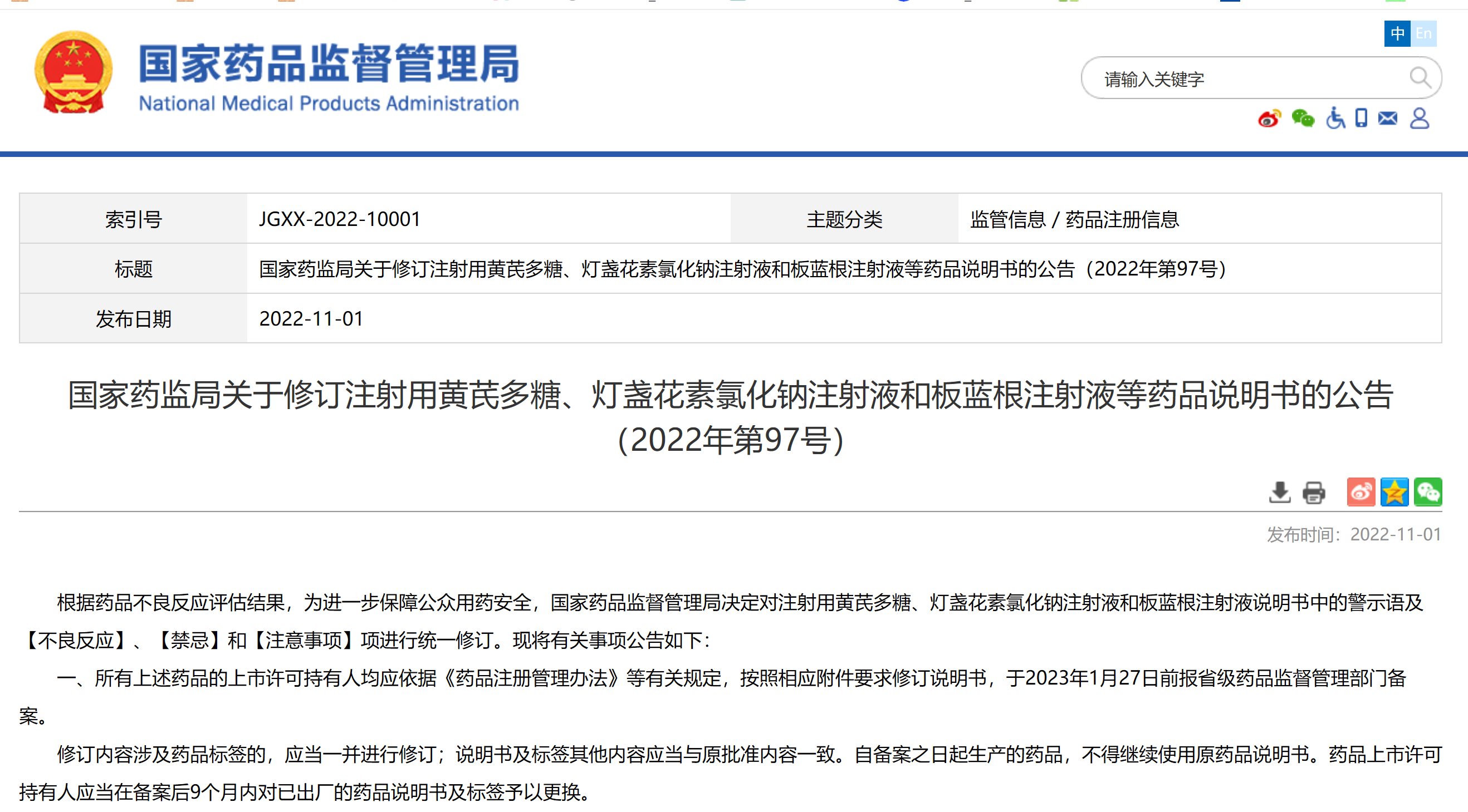 國(guó)家藥監(jiān)局關(guān)于修訂注射用黃芪多糖、燈盞花素氯化鈉注射液和板藍(lán)根注射液等藥品說明書的公告(2022年第97號(hào))