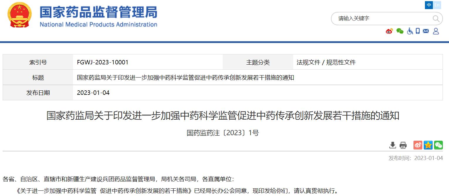 國(guó)家藥監(jiān)局關(guān)于印發(fā)進(jìn)一步加強(qiáng)中藥科學(xué)監(jiān)管促進(jìn)中藥傳承創(chuàng)新發(fā)展若干措施的通知