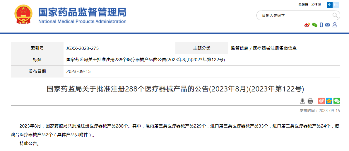 國(guó)家藥監(jiān)局關(guān)于批準(zhǔn)注冊(cè)288個(gè)醫(yī)療器械產(chǎn)品的公告(2023年8月)(2023年第122號(hào))
