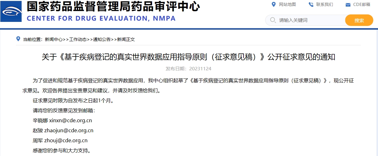 關(guān)于《基于疾病登記的真實(shí)世界數(shù)據(jù)應(yīng)用指導(dǎo)原則(征求意見(jiàn)稿)》公開(kāi)征求意見(jiàn)的通知